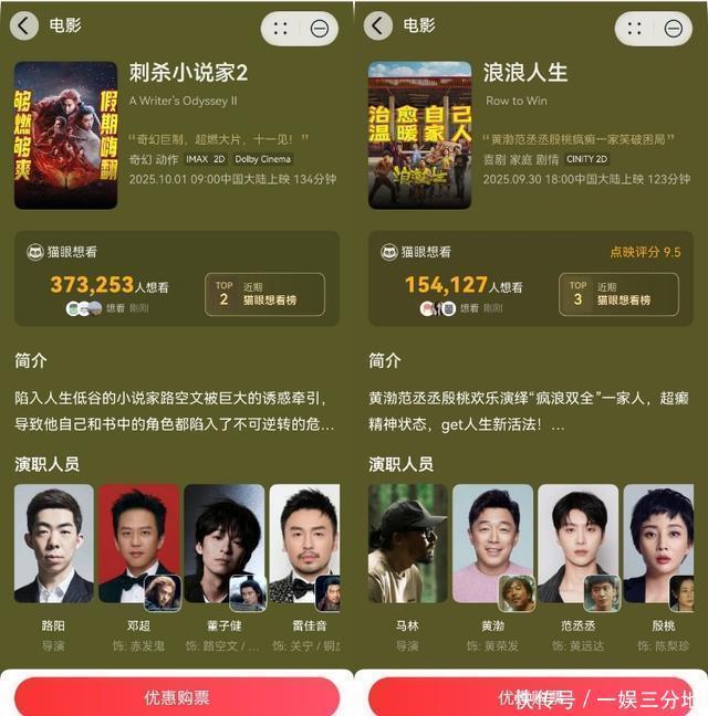 先说说电影,感觉今年国庆档还挺有看头的。比如讲家庭故事的《浪浪人生》,黄渤演喜剧的实力大家都懂,一出场基本就是票房保证;还有主打奇幻加动作的《刺杀小说家2》,上一部口碑就很不错,这续作估计也差不了,再加上邓超、雷佳音、董子健这主演阵容,肯定能吸引不少人进电影院。